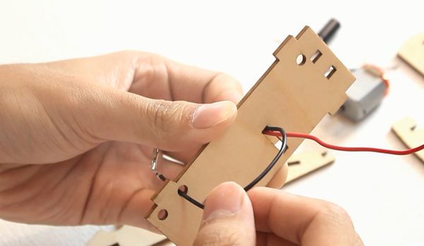 F1電容賽車的零件很快被鐳射切割完成,讓我們先把零件小心取出,開始組裝F1電容賽車。我們先把開關和端子電線插在對應的零件上,並且將端子電線穿到賽車底盤相對應的孔比特中;然後將端子電線分別插到開關中間及右側,安裝好車輪,接著用電洛鐵把端子電線跟馬達連接在一起,剩下的零件就按照設計圖上相應的位置一一對應組裝;最後再把電容器插到端子電線上便可完成F1電容賽車的組裝啦!